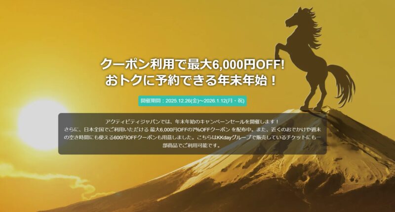 アクティビティジャパンでは、年末年始の限定クーポンを配布中!冬のアクティビティにぜひご利用ください