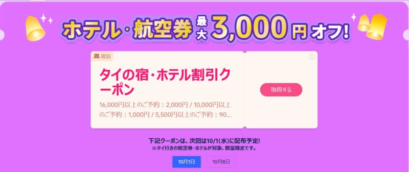 さらに、10月1日(水)と10月8日(水)の12時から、数量限定で航空券やホテルの予約に使える最大3,000円OFFの割引クーポンも配布予定です。