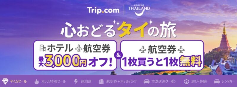 Trip.comではタイ旅行向けに特別セールを開催中!バンコクやプーケット、チェンマイなどの人気旅行先のホテルが最大80%OFFで、遊び・体験ツアーも割引価格で楽しめます。
